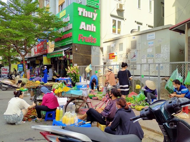 Tuy nhiên, do khu vực tập trung đông người, nhu cầu mua bán của người dân lớn… nên tại một số khu vực, khung giờ cao điểm thi thoảng xuất hiện một số gánh hàng rong từ nơi khác tụ tập, buôn bán lấn chiếm lòng đường, vỉa hè vi phạm các quy định về phòng, chống dịch Covid-19.